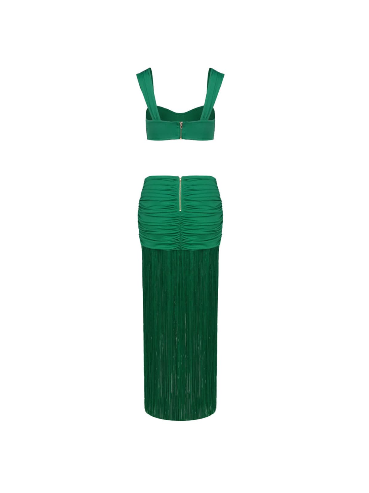 Elevate your style with the Ourania Ruched Fringe Skirt Set, designed to turn heads at any event. The ruched detailing flatters your silhouette while the playful fringe adds dynamic movement and flair. Perfectly balanced for a chic and confident look, this set effortlessly blends sophistication with a touch of boldness. Ideal for making a memorable statement, it’s your go-to choice for occasions where you want to stand out with grace and edge.